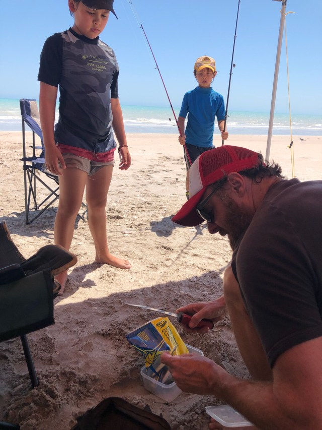 It’s mid-afternoon and we are all lazing under the shade of the tent awning that staves off the intense West Australian sun, reading or dozing, after a morning fishing on the brilliant white beach.