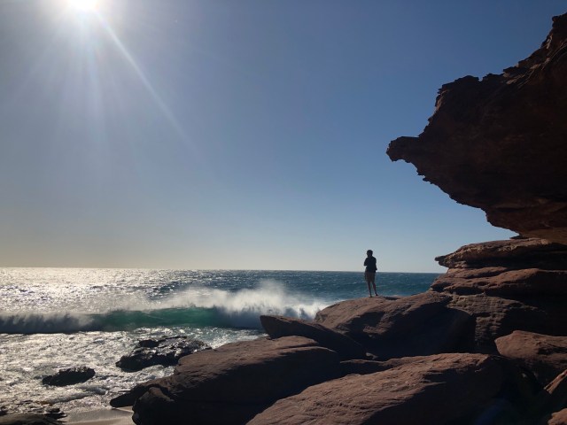 So here’s a nasty little gash in the West Australian coastline, where the ocean water surges and boils. The waves brutally invade the small beach before retreating again, only for the thin strip of sand to be reconquered by the next violent roller. The water, whipped by a constant south-westerly, heaves in before sucking back through deep channels that fill and empty with a steaming ferocity, hissing as the air rushes through the cramped spaces.