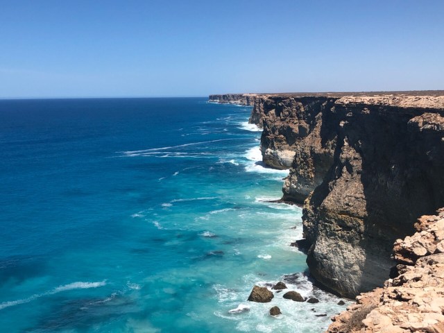 The road runs east from Western Australia, neatly meeting the inside of the Great Australian Bight near Eucla, just before the South Australian border. Here it tracks the sheer, vertiginous edge of Australia. Plummeting into the deep blue the wild eroded cliff faces, the obstinate perimeter of our land, stake their place in the surging water with breathtaking force.