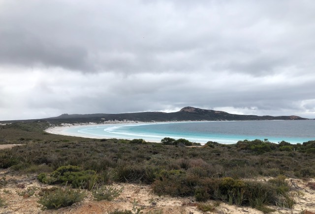 Against this murky, soggy panorama, the sand of Lucky Bay still sparkles vivid white, running from the dunes that are pocketed by green crags, across the beach and down to the tide where it is covered and revealed by the water.