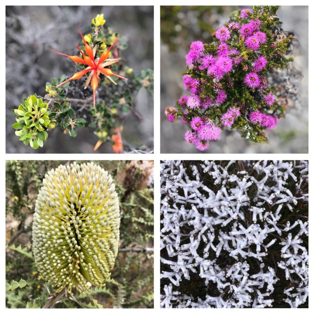 A fiery orange-red flower, like six bright trumpets bursting forth, with the tips of the petals spinning back as if the shrill sound of the fanfare could be physically embodied. Another is an explosion of purple, perfectly mimicking a joyous detonation of fireworks. The grand old banksia flowers, the local variety actually called the Showy Banksia, demonstrating its ostentatious appearance. The beauty of this flower, actually made up of hundreds of smaller tubular flowers, is dependent on the violent destruction of fire which at once ends the lifecycle of many, but starts the existence of this majestic blossom. And one final fascination – a tiny white furry specimen that looks like hundreds of minuscule pipe cleaners, or strange little caterpillars, that when combined on the bush resemble a huge lamington covered in shredded coconut.