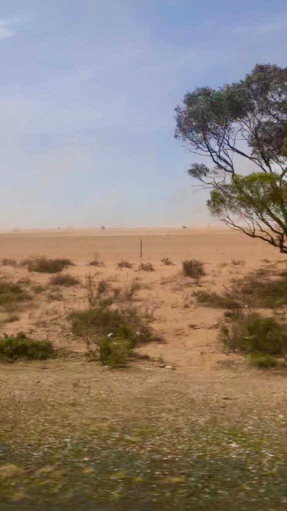 Outside the land stretches far as it flashes past us. Some of it looks like unimproved scrub with low-lying, resilient plants stubbornly surviving without it seems, any water whatsoever. Other sections are endless paddocks that have been cultivated at some stage. But everything is like ground bone and powder dry.